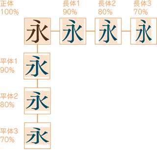 文字の変形も紙面のイメージを大きく変える要素だ。正体とは、文字に何も変形を加えない状態のことだが、縦比率や横比率を変えて文字を変形させることがある。限られたスペース内において、横組みに平体をかけると、行数が増える。縦組みで長体をかけると、行数が増える。スペースを変えずに、文字数を増やしたい場合にも有効なテクニックだ。適度な変形は、読みやすさを増加させるが、過度な変形は書体が持つデザイン性を損なうので注意が必要。左図のように、長体1、長体2、平体1、平体2…などと指定する。1は90%、2は80%の意味。