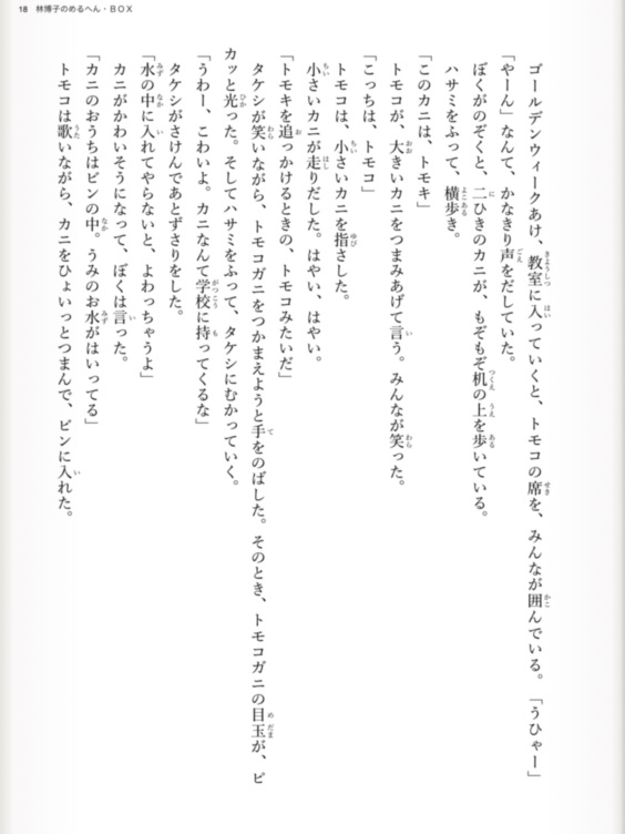 トモキは隣の席のトモコに悩まされている。だって少しもじっとしていないにぎやかな子なんだ。おまけに二人でカニの飼育係になってしまった──学校の中にはいろんな子がいていいのさ……