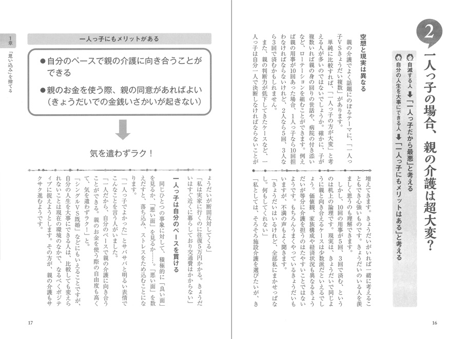 本書では、介護ジャーナリストである著者が、「親が元気なうち」に始まり「いざ親が倒れたとき」「施設を検討するとき」まで、それぞれのシチュエーションでどのような考え方・行動をとれば、自分の人生を犠牲にすることなく親を看ることができるか、そのポイントを見開き2ページでやさしく紹介します。