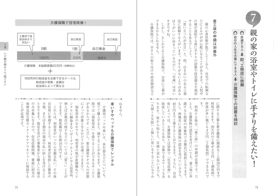 介護保険申請のプロセスから、介護保険のサービス内容、医療費の軽減制度について、地域包括支援センターとのつきあい方、高齢者施設選びのポイント、役立つ「介護家計簿」の付け方など、実用情報も盛りだくさん。