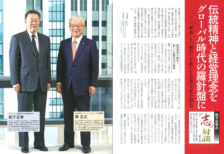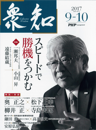 2017年9-10月号の巻頭は、三井住友フィナンシャルグループの経営の舵取りを担ってきた奥正之名誉顧問とパナソニック松下正幸副会長との特別対談。どのように伝統精神を受け継ぎ、激動の経済情勢に対応するかなど、幅広いテーマで語り合っていただきます。また、特別企画として、ファーストリテイリング会長兼社長の柳井正氏と日本総合研究所会長の寺島実郎氏が対談。混迷する世界で日本企業が取るべき道を論じ合っていただきます。