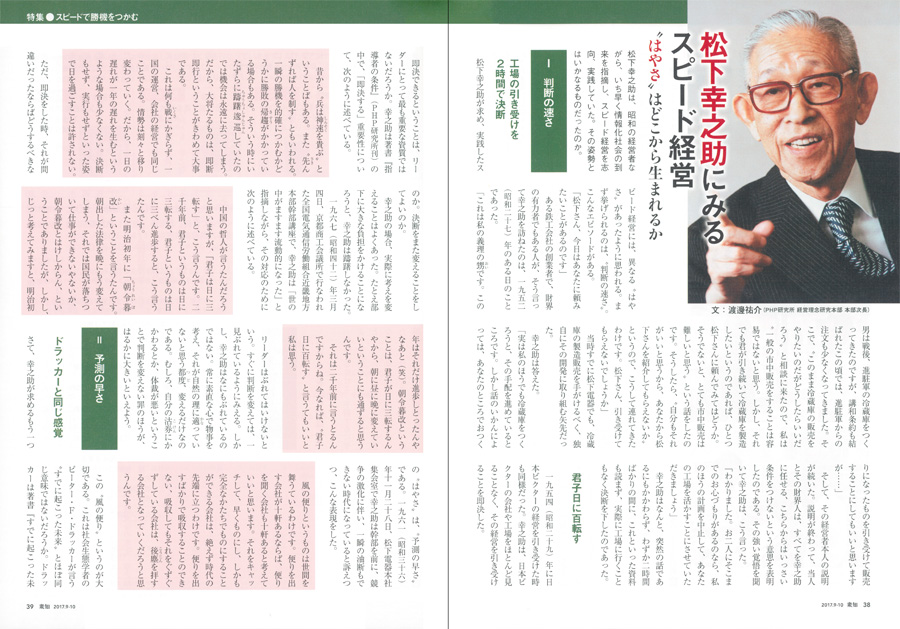 シリーズでは、紀伊國屋書店の高井昌史社長が全国の有力学校法人トップと教育の未来を語る新企画がスタート。第1回は、早稲田大学の鎌田薫総長にご登場いただき、正解がない問題に果敢に挑戦する人材をいかに育てるかをテーマに語り合っていただきます。「京都企業シリーズ」では、インナーウェアトップメーカーのワコール安原弘展社長に経営哲学をうかがいます。また、「松下幸之助経営塾」の講義録では、作家の童門冬二氏が歴史をひもときながら、経営トップが果たすべき役割を語ります。