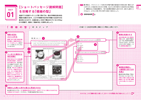 本書では、奇数日に「読む型」、偶数日に「解く型」を使って、同じ形式の大問(第1問A、第1問Bなど)に取り組みます。そうすることで、俯瞰的に問題をとらえながら個々の設問に早く正確に解答できる「得点力」を養うことができるのです。