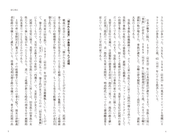 「日本の国は、これから皇室をどのようにしていこうと考えているのだろうか。それは、日本の伝統とも深くかかわる重要な事柄なのである。現在、皇室をめぐってさまざまな問題が起きている。とくに皇族の数の減少は深刻で、将来において皇位継承がつつがなく行われるかどうかについて、大きな不安が生まれている。本書では、近年における皇室をめぐるさまざまな話題を取り上げつつ、そうした事柄が生じてきた背景を明らかにすることをめざした。そのなかでは、女性皇族のことが極めて重要な事柄として浮上してくるはずである」――〈はじめに〉より