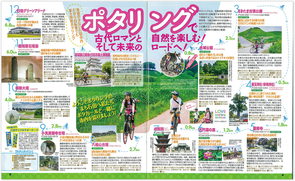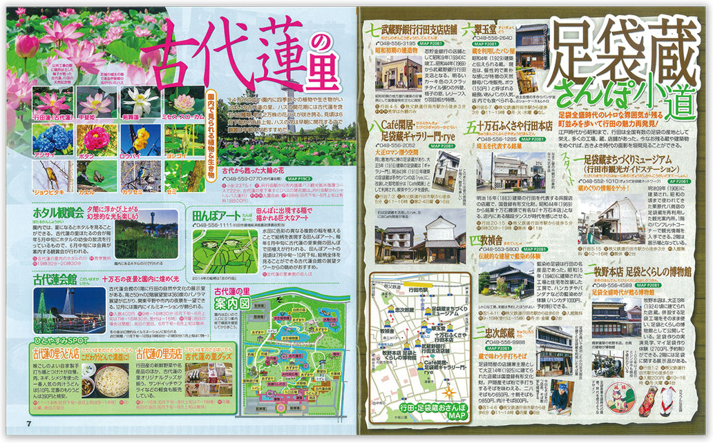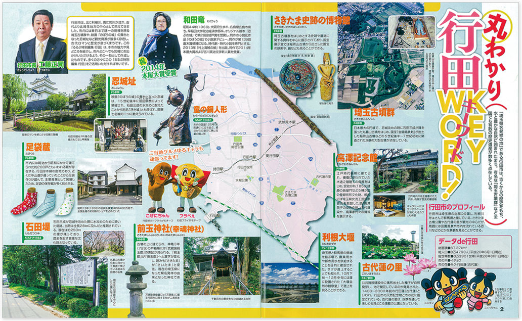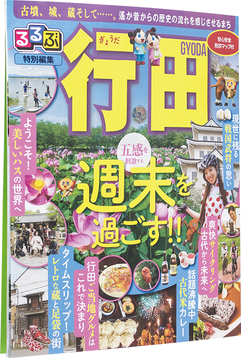 JTBパブリッシングが発行する「るるぶ」の特別編集の「行田」版。弊社が得意とするエディトリアルデザインの技術を使い、ページ全体に写真、イラスト、アイコン、文字をダイナミックに使用し、観光名所のそれぞれの個性を楽しく表現。紙ならではしかできないデザインの工夫を細部にまで施し、右から左、上から斜め下に時には見開き全体を使い円を描くように情報にメリハリをもたせ雑誌エディトリアルデザインを制作した。